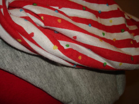 I made this hoodie from a very unique "Sorry I'm Taken" tee shirt. I made the hood of gray jersey and lined it with red and white striped jersey with small hearts. I made the sleeves from red jersey and red and white tattoo heart fabric.